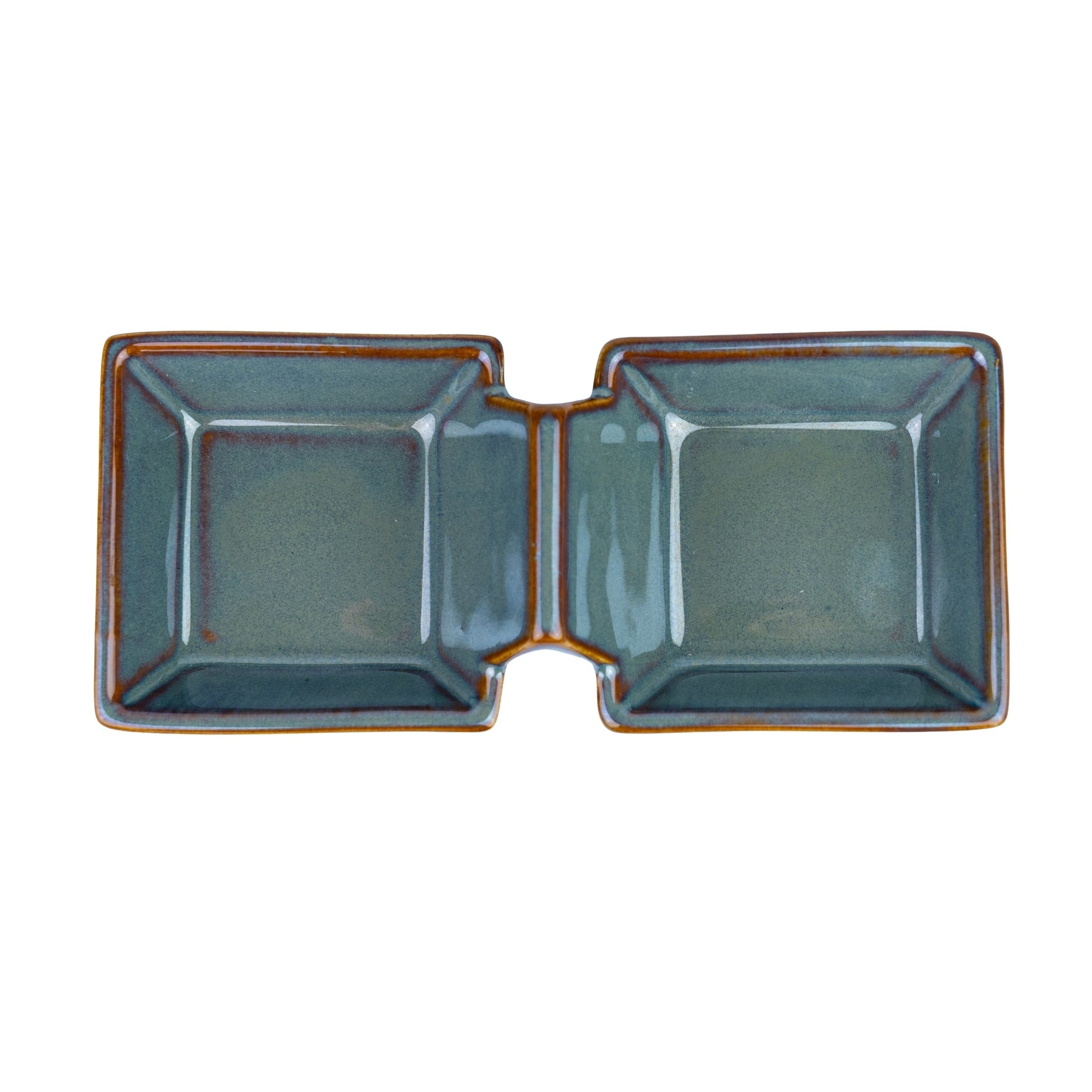 Este prato duplo destaca-se pelo seu design prático e elegante com dois compartimentos separados. A cor verde jade suave traz uma sensação de frescura e conexão com a natureza, criando uma apresentação elegante e apetitosa. A pega central proporciona um manuseamento seguro e facilita o transporte do prato da cozinha para a mesa. Os dois compartimentos quadrados permitem servir diferentes molhos, condimentos ou aperitivos simultaneamente sem que se misturem. A borda com acabamento natural em tons castanhos/dourados adiciona um toque rústico e sofisticado.