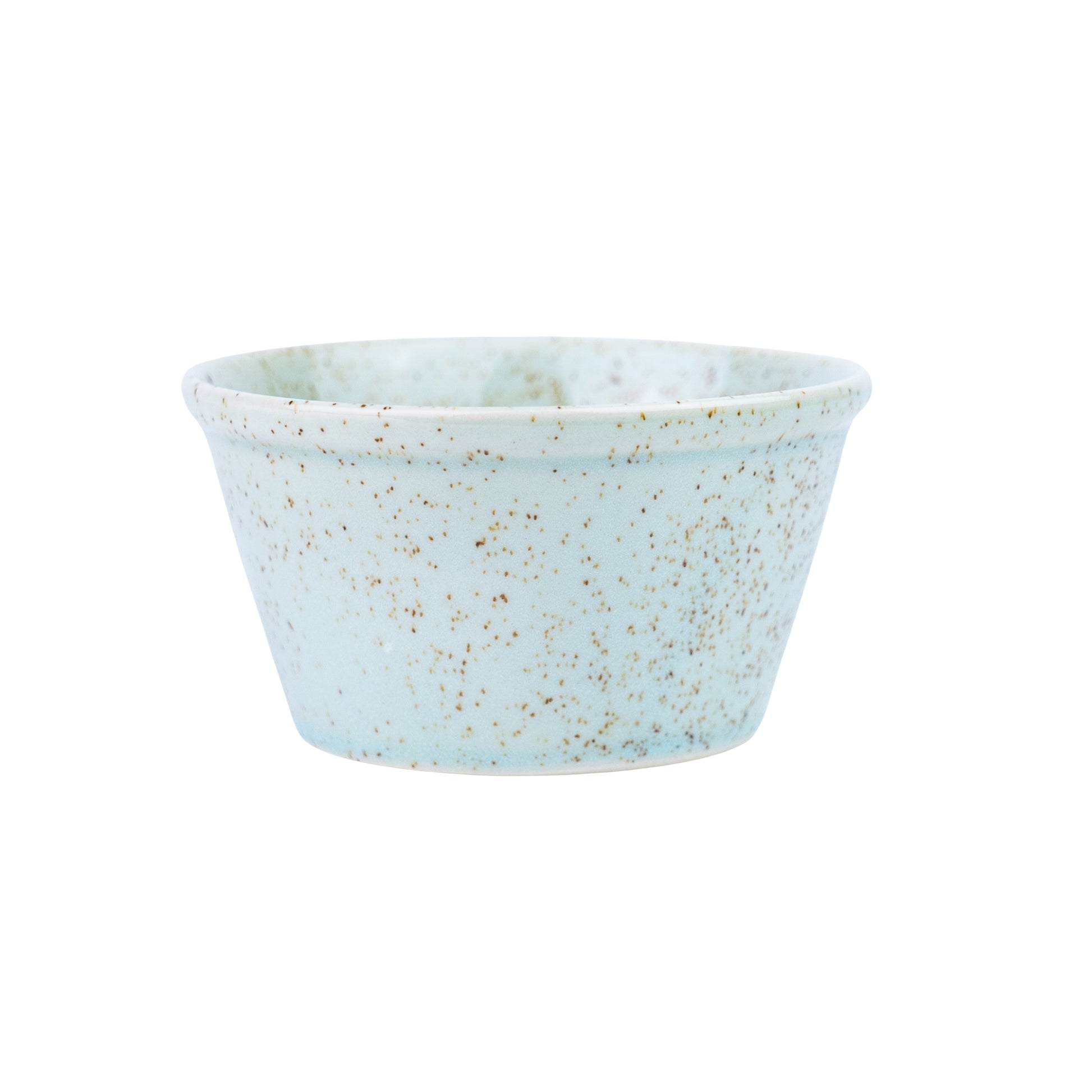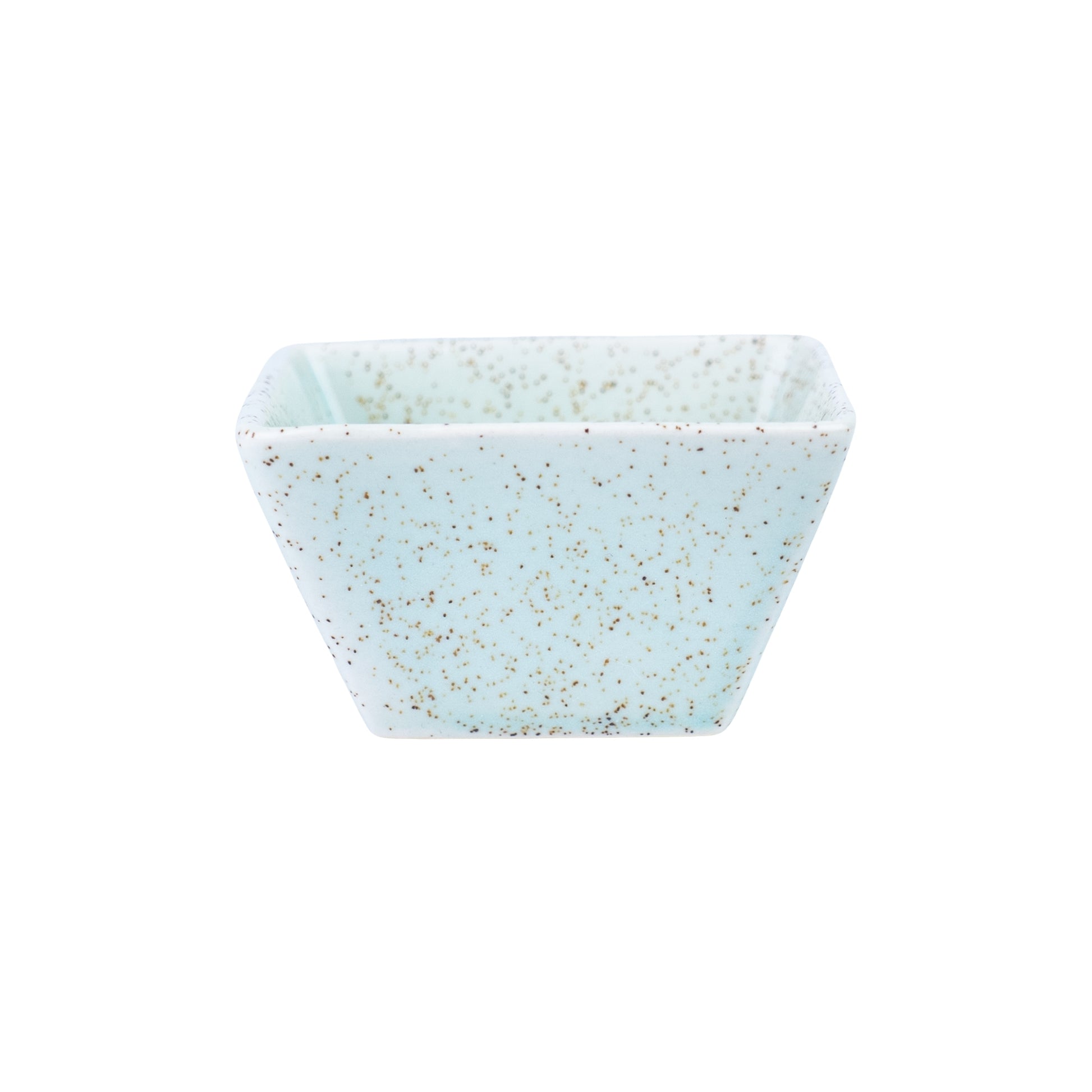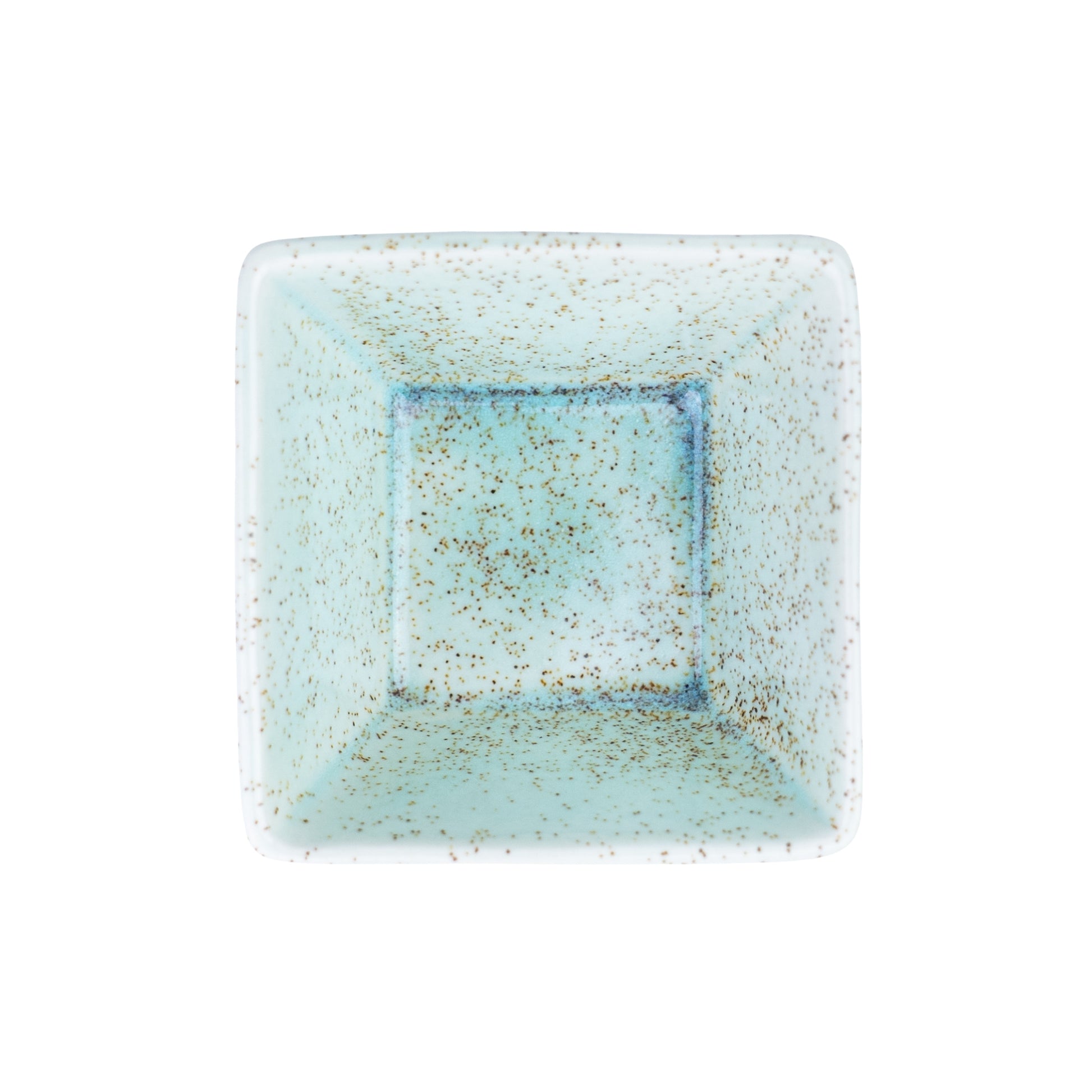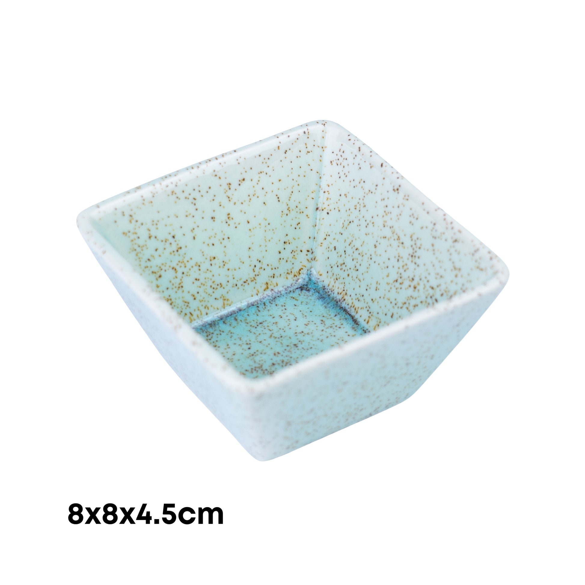 Cada tigela é fabricada em cerâmica de alta qualidade com acabamento speckled (pontos naturais) que cria uma textura sofisticada e artesanal. O interior apresenta um degradê suave de verde-água para azul, criando profundidade e interesse visual. O formato quadrado é ideal para apresentações modernas e elegantes.
