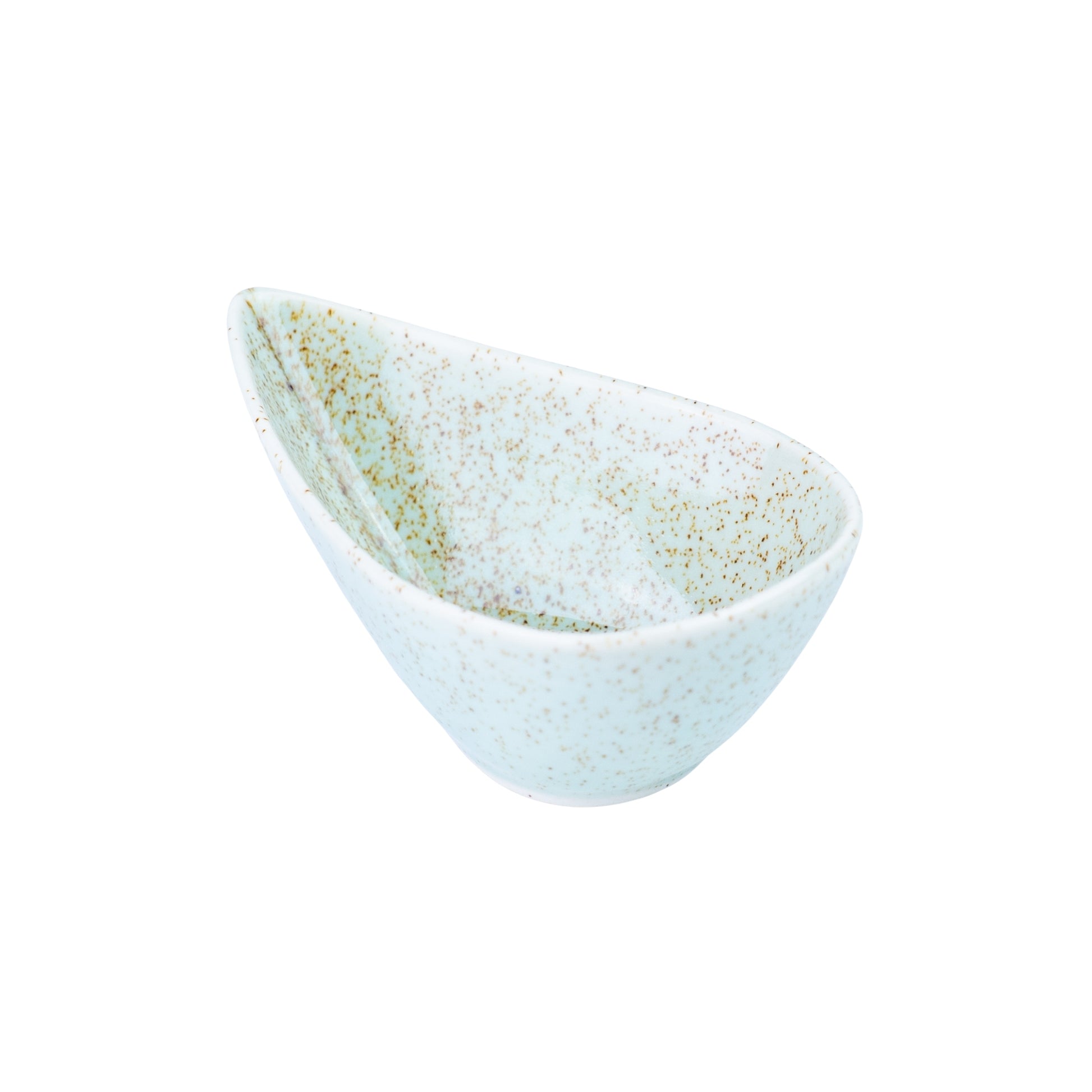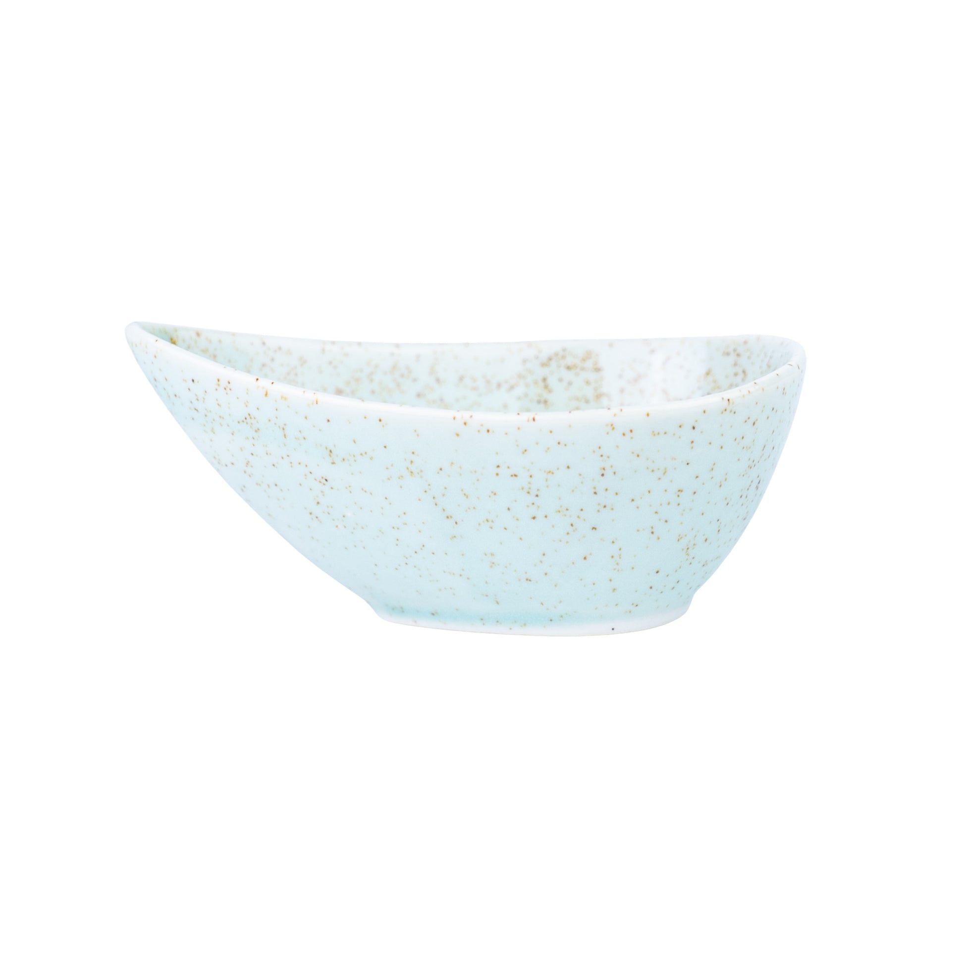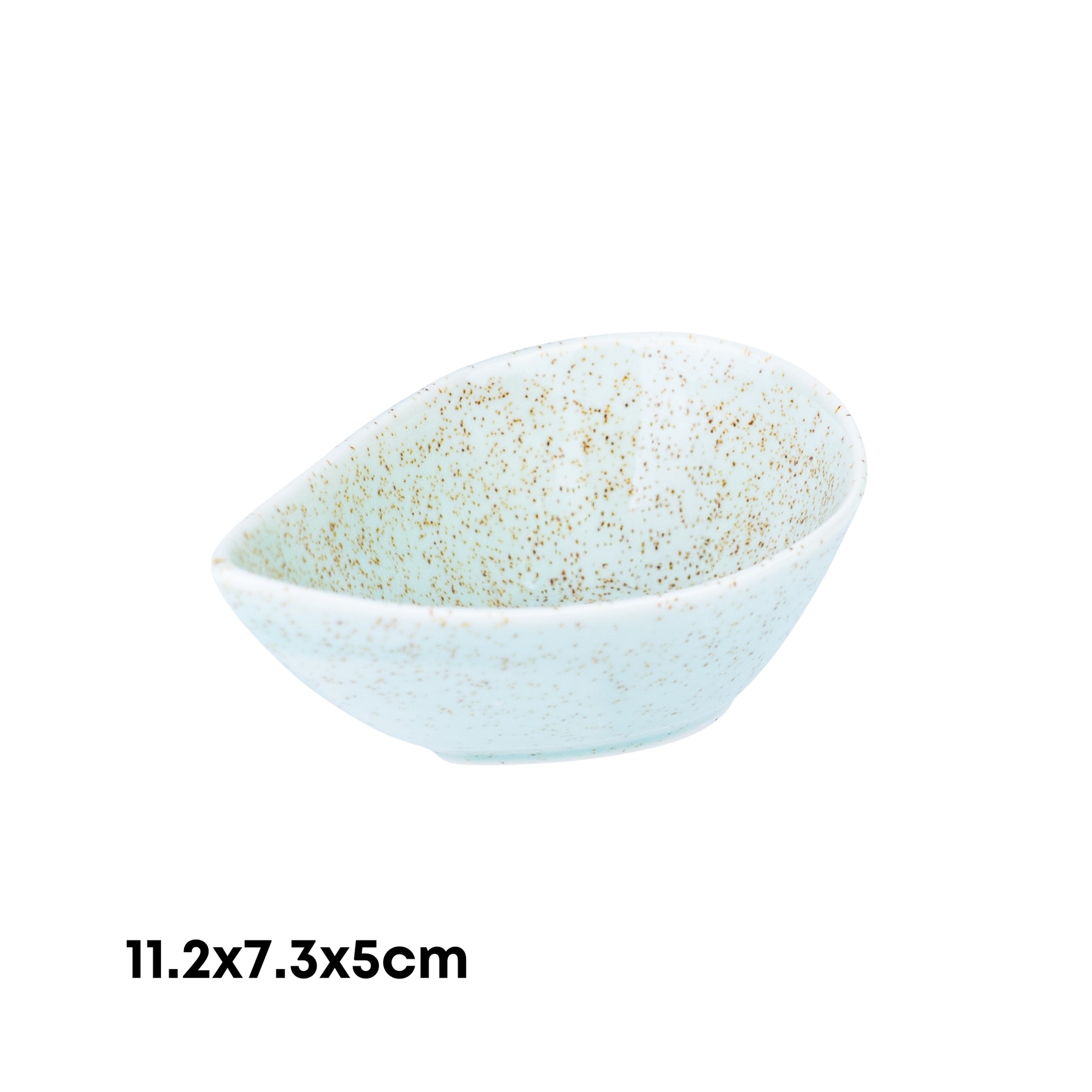 Cada tigela é fabricada em cerâmica de alta qualidade com acabamento speckled (pontos naturais) que cria uma textura sofisticada e artesanal. O interior apresenta um degradê suave de verde-água para azul, criando profundidade e interesse visual. O formato de folha é ideal para apresentações modernas e elegantes com inspiração na natureza.