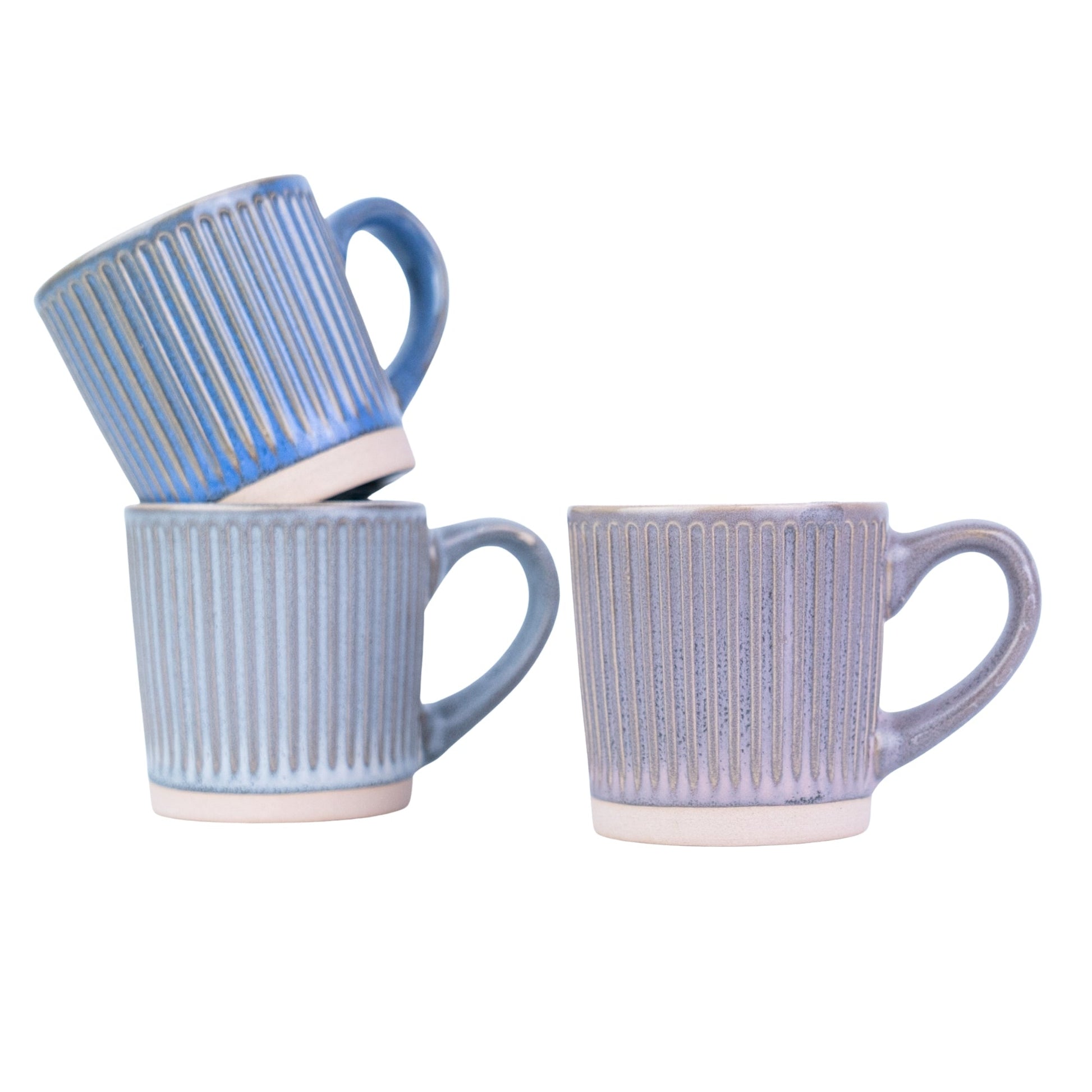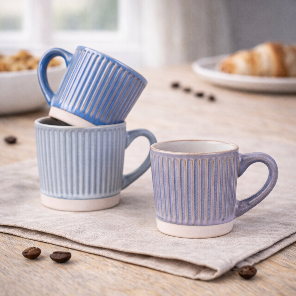 Escolha entre três variações de cores suaves e relaxantes - roxo/lilás delicado, azul claro sereno ou azul vibrante - cada uma com o mesmo design texturizado único. As cores degradê criam um efeito visual elegante que adiciona personalidade ao seu ritual de café.
