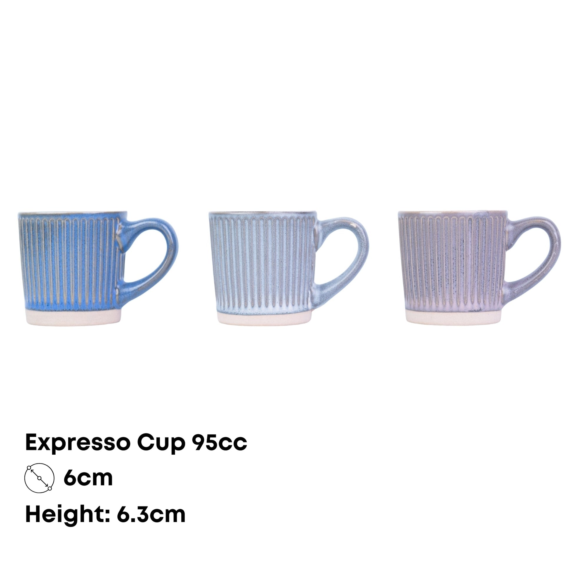 Com dimensões compactas de 6cm x 6,3cm, esta chávena foi especialmente concebida para realçar o sabor e o aroma do espresso. A textura vertical em relevo que percorre toda a superfície cria um efeito visual e tátil único. As cores degradê suaves (roxo/lilás, azul claro ou azul) contrastam harmoniosamente com a base em tom natural, conferindo um aspeto moderno e artesanal. A capacidade de 95cc é perfeita para um espresso duplo ou café curto, mantendo a temperatura ideal da bebida.