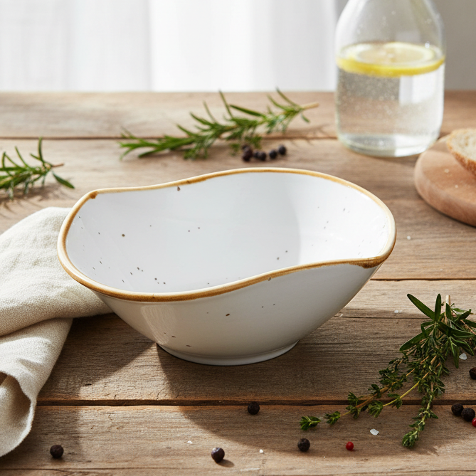 Esta tigela destaca-se pela sua forma orgânica única com bico que cria um efeito visual moderno e sofisticado. O design irregular adiciona movimento e caráter à peça, enquanto o bico funcional facilita o serviço de molhos e líquidos. A cor branca versátil combina com qualquer estilo de mesa, enquanto a borda dourada proporciona um contraste elegante e refinado. A superfície lisa facilita a limpeza e proporciona uma apresentação impecável dos alimentos. A forma orgânica moderna combina perfeitamente com estilos de mesa contemporâneos.