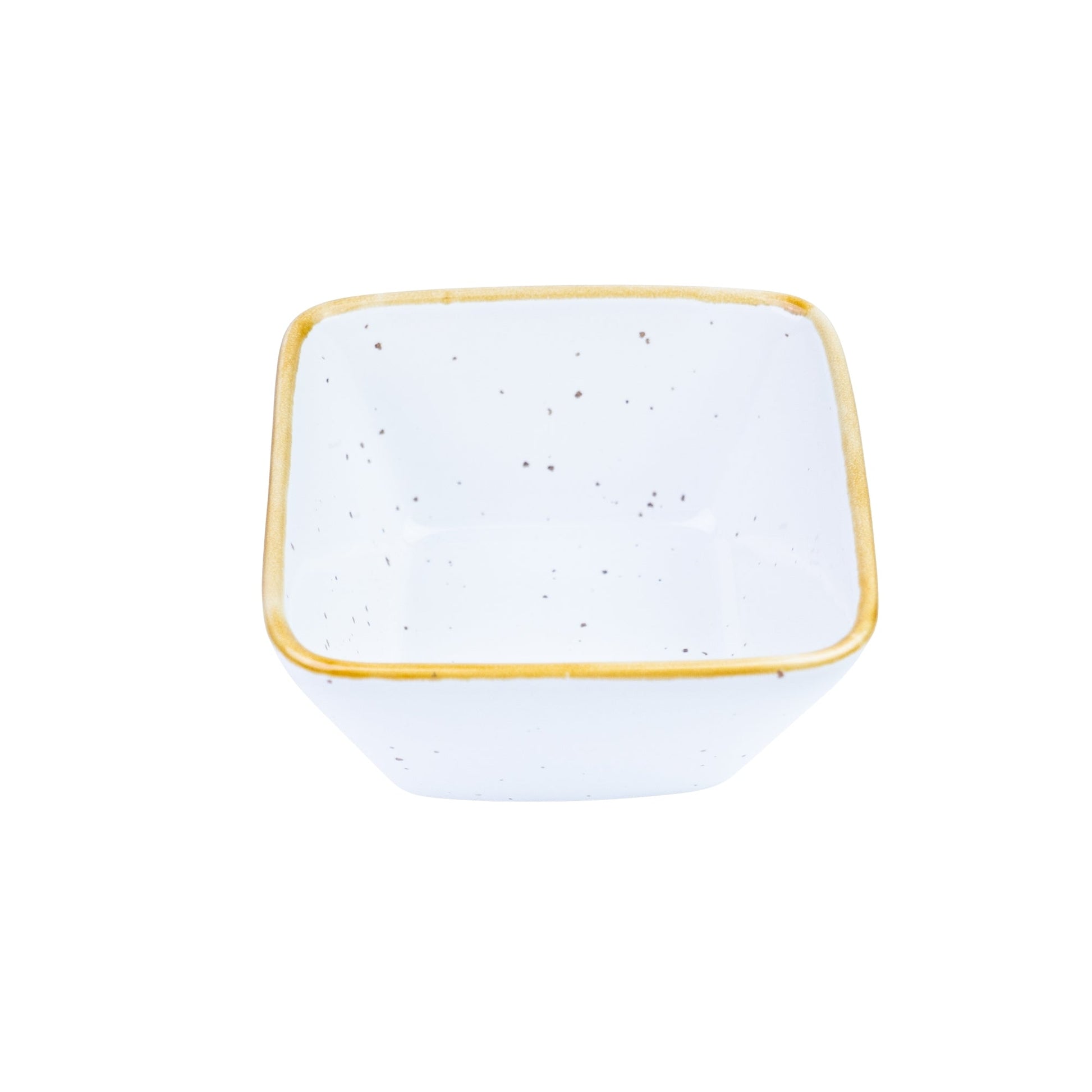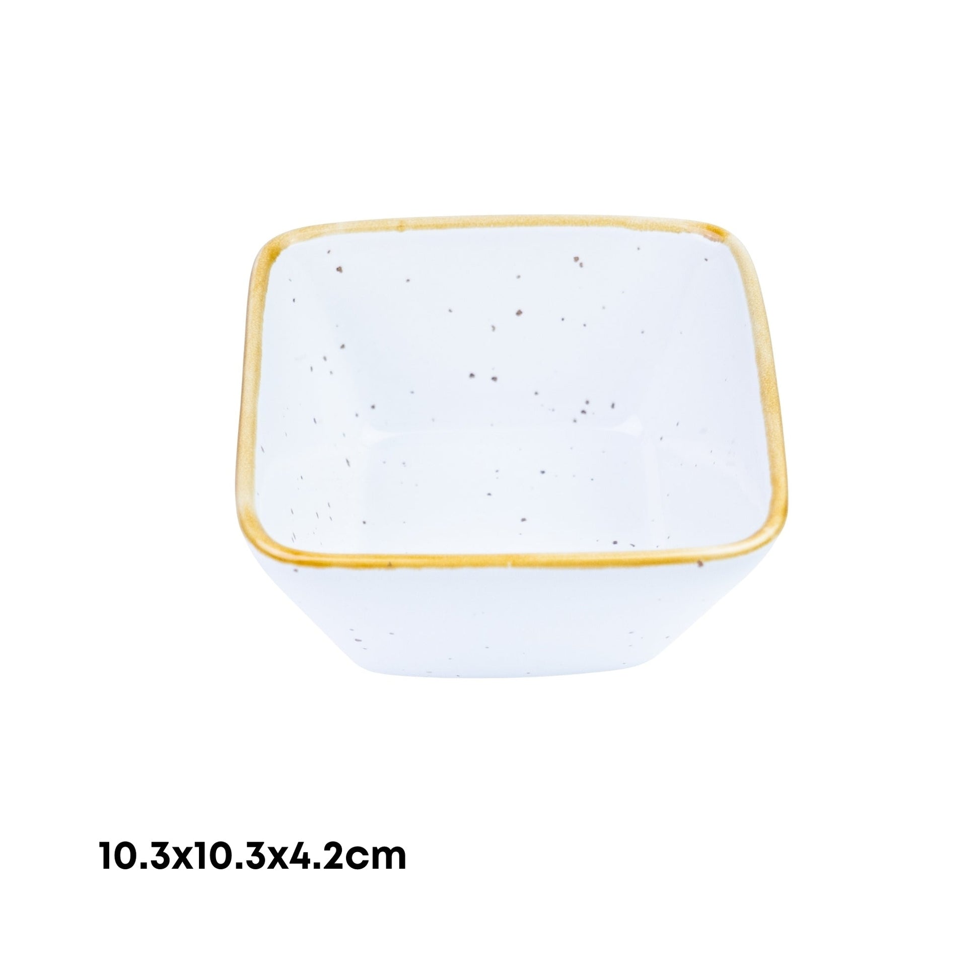 Sirva os seus pratos com elegância com esta encantadora tigela quadrada pequena de cerâmica! Apresentando um design sofisticado em branco puro com borda dourada elegante, esta tigela de 10,3x10,3x4,2cm é perfeita para molhos, aperitivos, sobremesas, petiscos e muito mais.