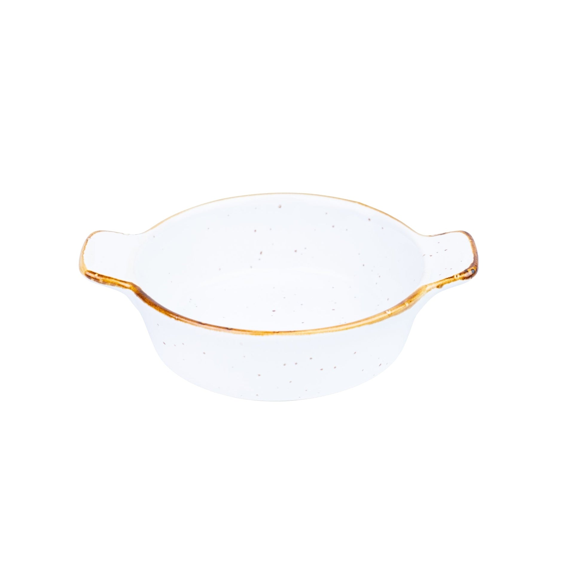Sirva os seus pratos com elegância com esta encantadora tigela redonda com asas de cerâmica! Apresentando um design sofisticado em branco puro com borda dourada elegante e duas asas práticas, esta tigela de 14x11x3,8cm é perfeita para sopas, aperitivos, sobremesas, molhos e muito mais.