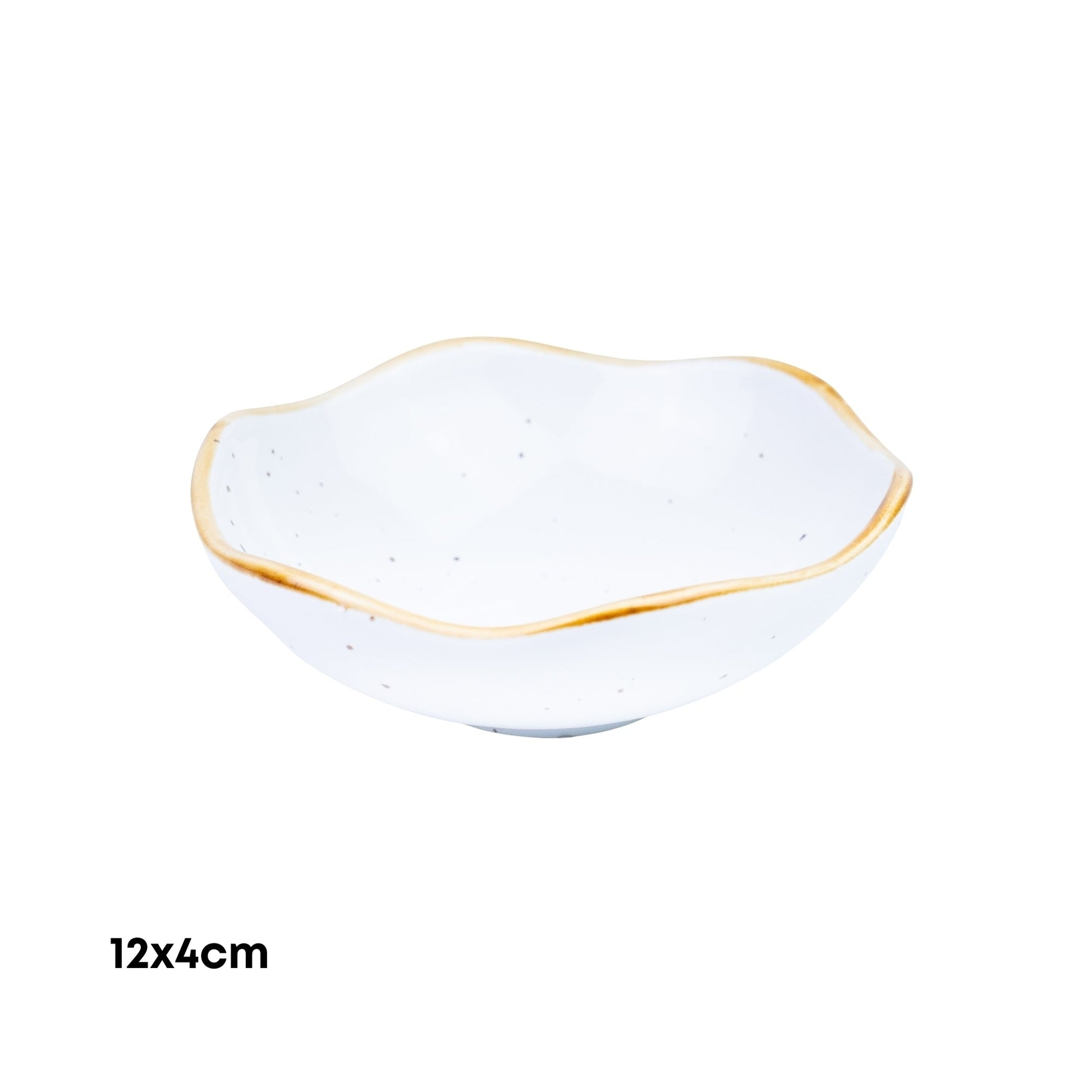 Sirva os seus pratos com elegância com esta encantadora tigela orgânica pequena de cerâmica! Apresentando um design sofisticado em branco puro com borda dourada elegante e forma orgânica única, esta tigela de 12x4cm é perfeita para molhos, aperitivos, sobremesas, petiscos e muito mais.