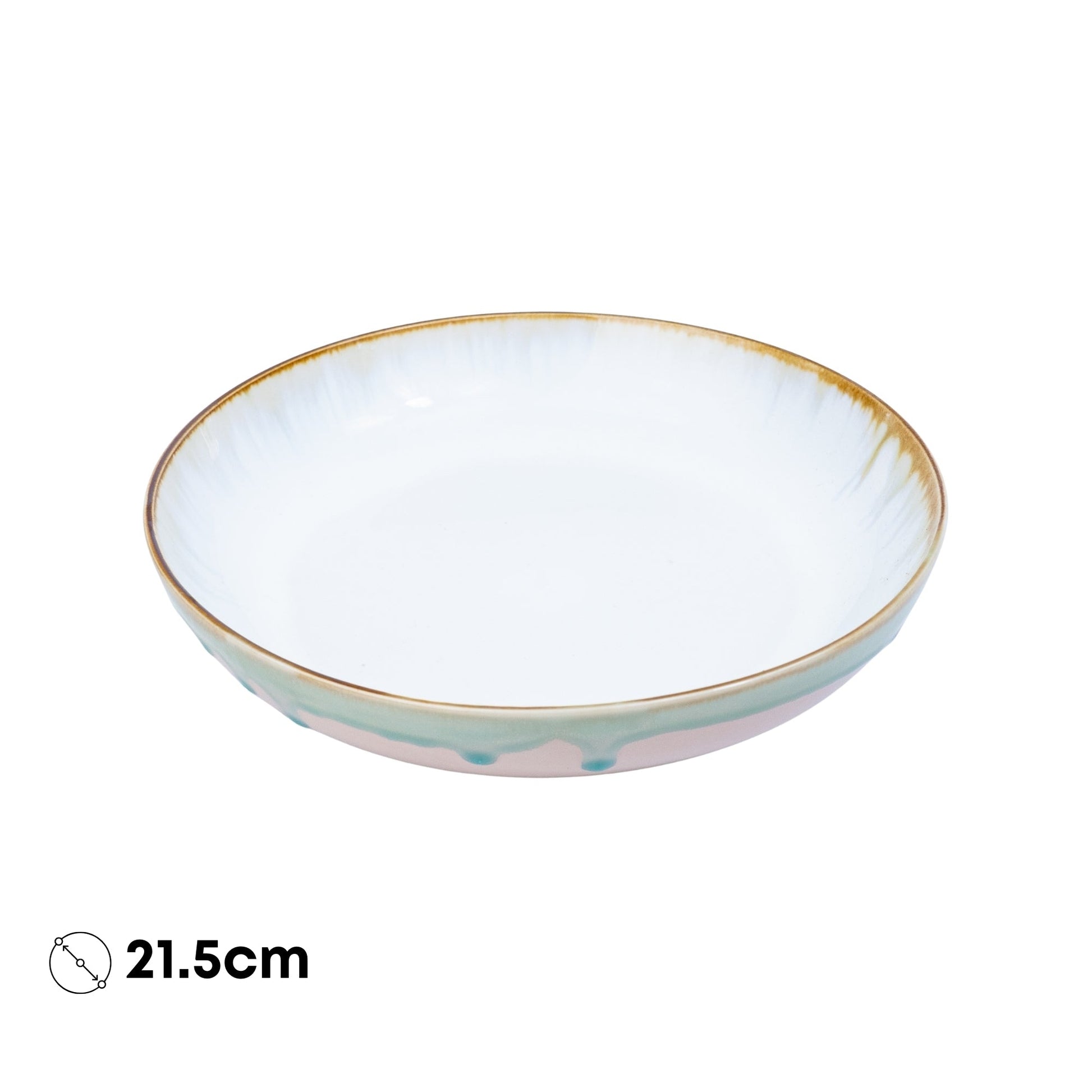 Este elegante prato redondo médio em cerâmica destaca-se pelo seu design artístico e delicado, com acabamento predominantemente branco no interior e um exterior decorado com pinceladas em verde água e rosa suave. A borda em dourado envelhecido confere um toque artesanal premium.
