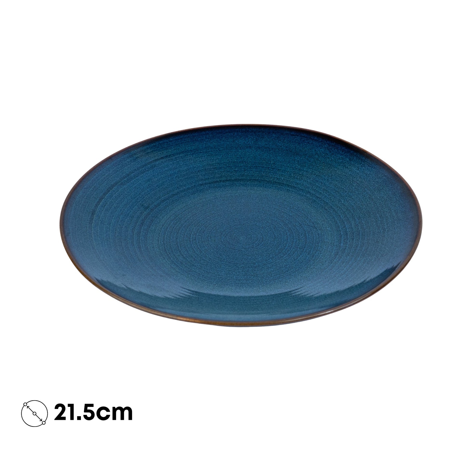 Este elegante prato redondo médio em cerâmica destaca-se pelo seu design sofisticado em azul petróleo profundo com nuances que variam entre o azul e o verde-azulado. A borda em dourado envelhecido confere um toque artesanal premium.