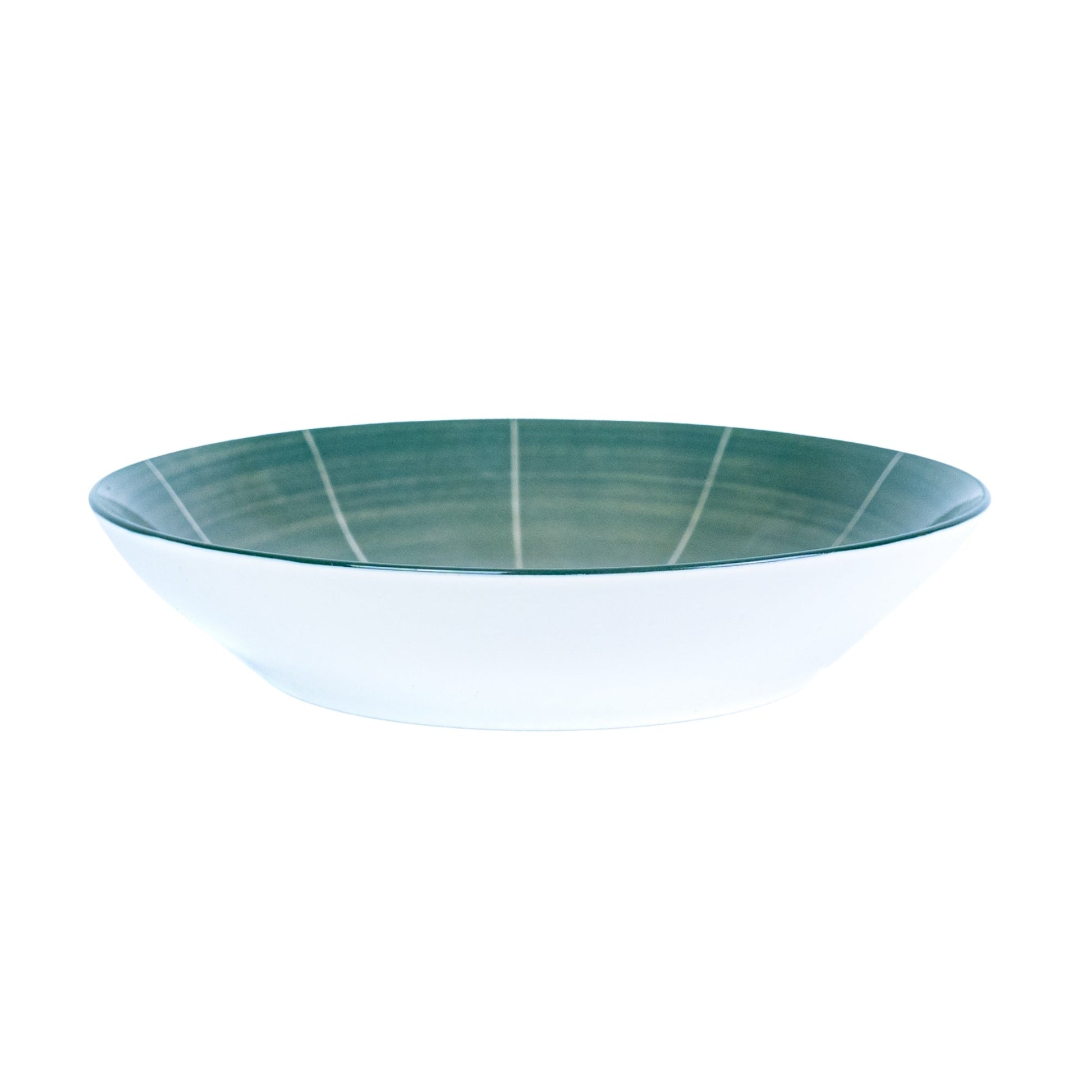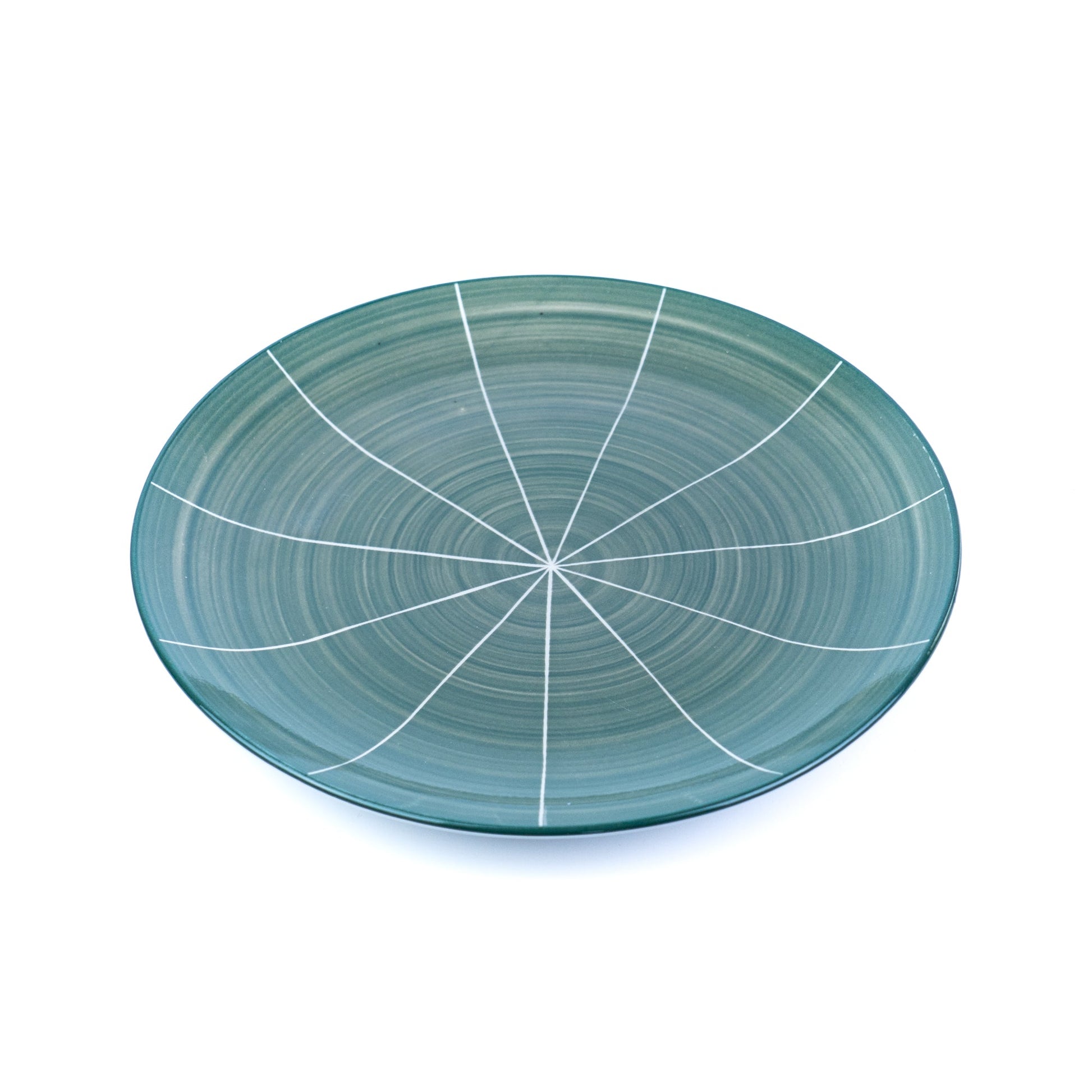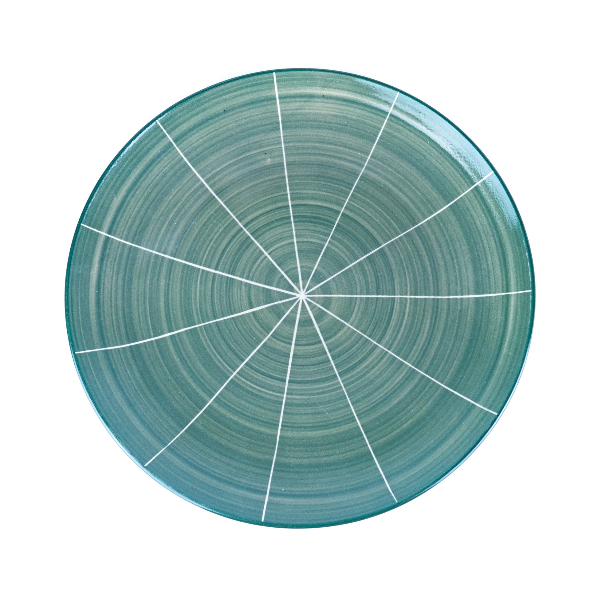 Este conjunto destaca-se pelo seu padrão radial único que cria um efeito visual dinâmico em cada peça. As linhas brancas irradiam do centro sobre o fundo verde turquesa vibrante, criando um design moderno e refrescante inspirado na natureza. O padrão combina linhas retas que se estendem do centro como raios de sol, adicionando profundidade e movimento visual. O exterior branco puro proporciona um contraste elegante, tornando cada refeição numa experiência visual especial e energizante.
