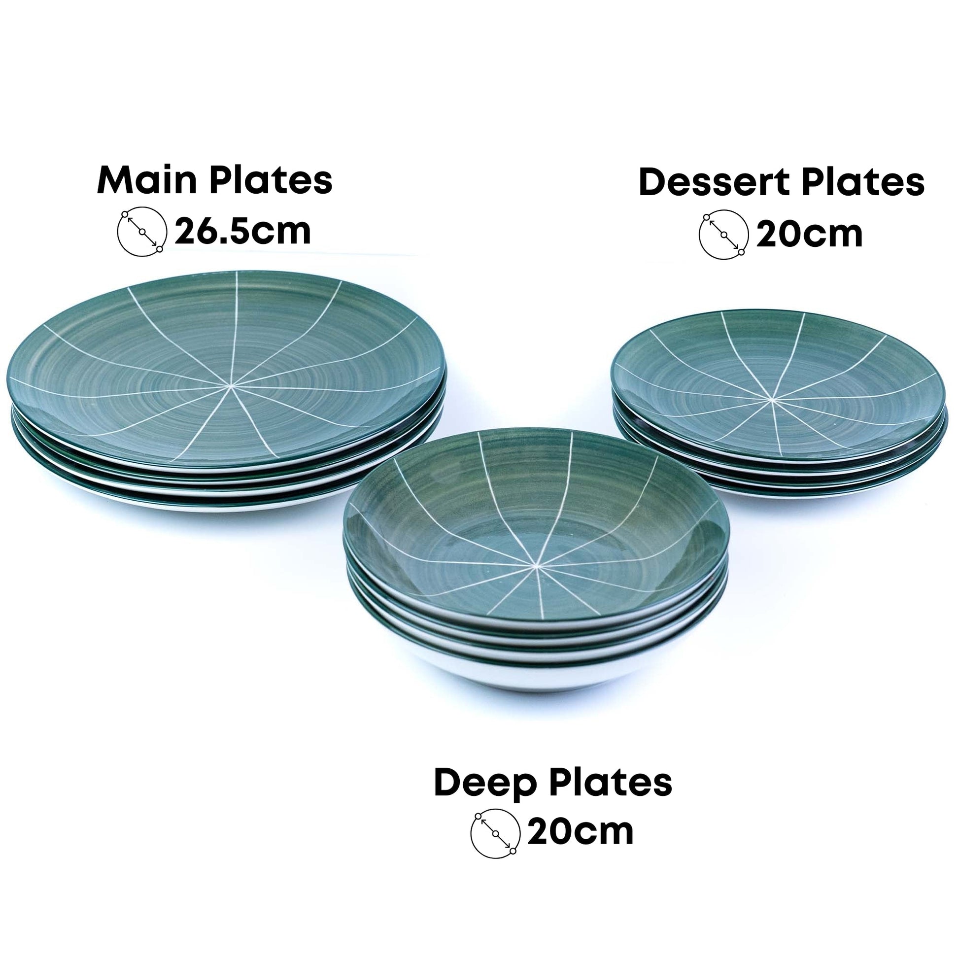 Perfeito para quem procura um conjunto de louça completo com design diferenciado e cores vibrantes. Ideal para famílias pequenas, casais, recém-casados, inaugurações de casa, presentes de casamento ou aniversário. Excelente para criar uma mesa elegante tanto para o dia a dia como para ocasiões especiais. O conjunto de 12 peças é o tamanho ideal para famílias de 4 pessoas ou para quem gosta de receber convidados. O design artístico com padrão radial em verde turquesa torna cada refeição numa experiência especial e Instagram-worthy!