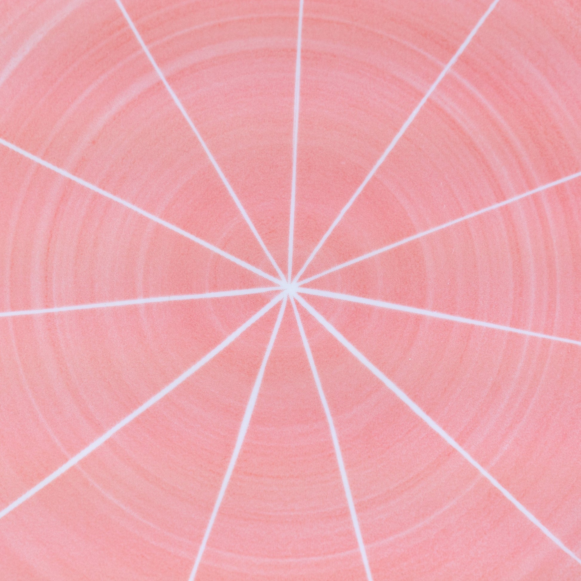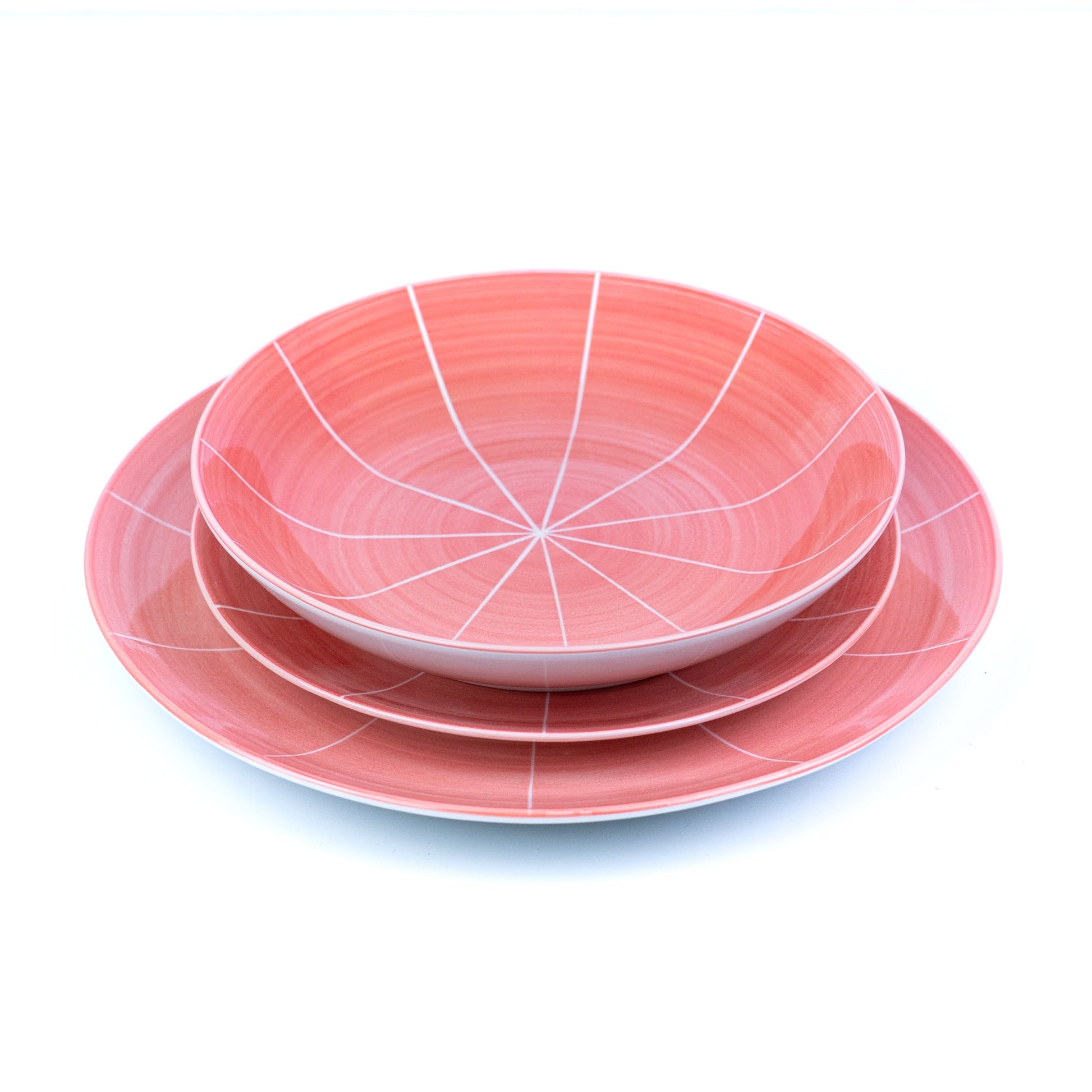 Este conjunto destaca-se pelo seu padrão radial único que cria um efeito visual dinâmico em cada peça. As linhas brancas irradiam do centro sobre o fundo rosa suave, criando um design moderno e romântico. O padrão combina linhas retas que se estendem do centro como raios de sol, adicionando profundidade e movimento visual. O exterior branco puro proporciona um contraste elegante, tornando cada refeição numa experiência visual especial e encantadora.